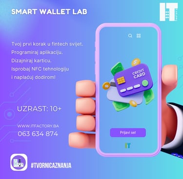 SMART WALLET LAB vodi djecu kroz cijeli fintech ciklus: od dizajniranja vlastite kartice i aplikacije, do korištenja NFC tehnologije i testiranja plaćanja. Uz pomoć umjetne inteligencije, učesnici dobijaju personalizirane savjete o sigurnosti, pametnom trošenju i zaštiti podataka. Prvi korak ka digitalnoj pismenosti i odgovornom korištenju tehnologije!